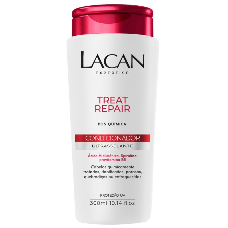 Condicionador para cabelos ressecados e danificados por processos químicos. Lacan Treat Repair Pós Química com ação desembaraçante e antifrizz, condiciona e restabelece a saúde natural dos fios, deixando-os disciplinados. Tem proteção UV, é elaborado com Ácido Hialurônico, Pro Vitamina B5 e Spirulina e possui a tecnologia Treat Repair, uma composição de ativos de qualidade, enriquecidos com Vitaminas, Sais Minerais, Proteínas, Ácidos Graxos e Açúcares, que promovem uma solução ultrasselante, que hidrata profundamente as cutículas e garante fios macios e sedosos.