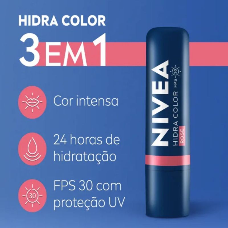 O Hidratante Labial NIVEA Hidra Color vai além da beleza, oferecendo um cuidado completo para os seus lábios. Sua fórmula avançada 3 em 1 proporciona 24h de hidratação, cor intensa e proteção contra raios UVA/UVB. Enriquecido com manteiga de karité, óleo de amêndoas orgânico e vitamina E, garante lábios macios, hidratados e protegidos do ressecamento. Sua cor intensa e versátil pode ser usada nos lábios e bochechas, criando um look natural e saudável. Livre de óleo mineral, sua textura cremosa desliza suavemente, proporcionando um acabamento rosé intenso e luminoso. Cuide da beleza dos seus lábios com um toque de cor e hidratação que dura o dia todo.